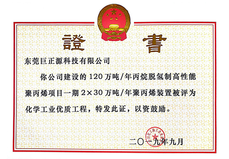 近日,中国化工施工企业协会公布全面提升工程质量创建优质精品工程活动成果。巨正源公司投资建设的“120万吨/年丙烷脱氢制高性能聚丙烯项目”一期2×30万吨/年聚丙烯装置获评全国“化学工业优质工程”。