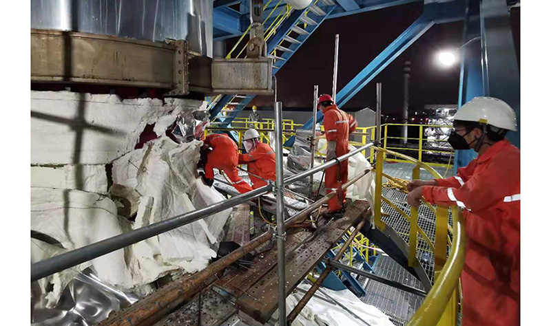 2月12日早上,丙烷脱氢装置再生空气进料加热炉锥段和直管管段焊缝开裂,裂缝长达2.5m,650℃的高温再生空气从裂缝漏出。公司高度重视,立即启动紧急预案,特护运行,讨论堵漏方案,落实特殊作业施工队伍,按照政府及公司规定完成入厂教育及疫情期间人员备案,严防死守做好防疫工作,组织高温堵漏队伍进场。