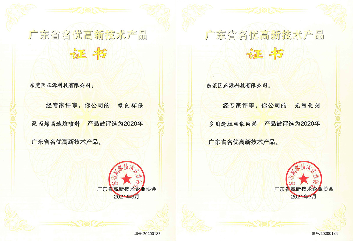 近日,巨正源科技公司自主研发、生产的“绿色环保聚丙烯高速熔喷料”、“无塑化剂多用途拉丝聚丙烯”两类产品荣获“广东省名优高新技术产品”称号,标志着巨正源的高分子材料研发取得新成效、迈上新台阶。