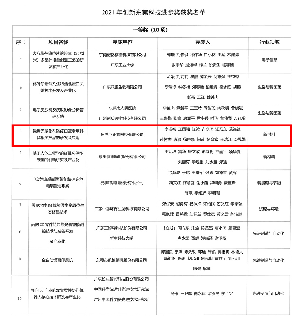 近日,2021年创新东莞科学技术奖获奖项目名单发布。东莞巨正源科技有限公司研发的“绿色无塑化剂防疫口罩专用料及相关产品的研发及应用”项目荣获东莞市科技进步奖一等奖。