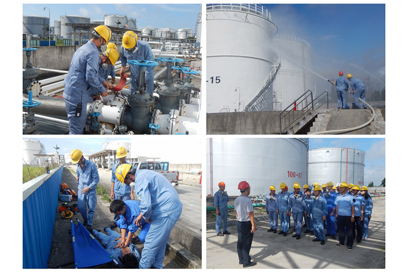 上午9:00,15号罐进出油短管发生泄漏,警报铃响起,演练开始。救援队伍向事故点紧急集结、各应急小组迅速开展救援工作。演练模拟堵漏过程中,由于金属意外碰撞产生火花,现场发生火灾。抢险救灾组、物资供应组使用水枪、泡沫枪扑救初起火灾。在向公司领导报告后,通信联络人员按指示向茂港消防大队请求救援。9:30,火势失控,引起油罐爆炸,救援人员紧急撤退。在消防大队抵达现场后,应急小组协助消防员开展灭火救灾工作。经过紧张的应急处置,火灾在9:42分最终被扑灭。