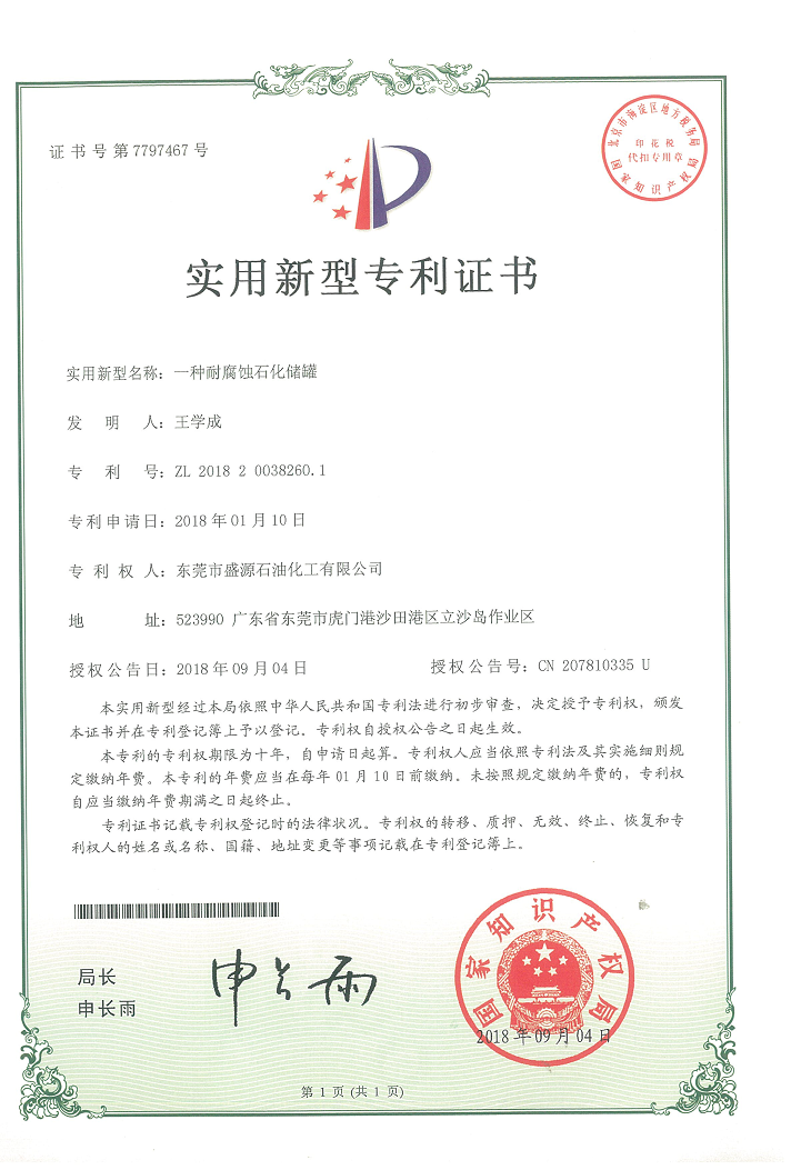 实用新型耐腐蚀储罐专利证书