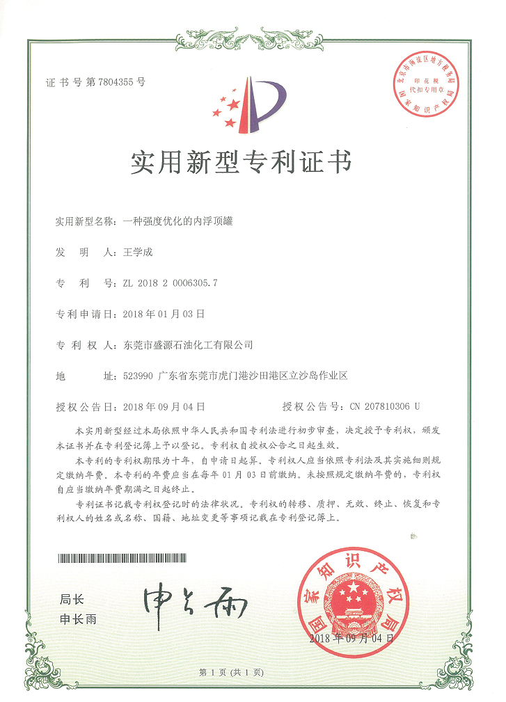 实用新型内浮储罐专利证书