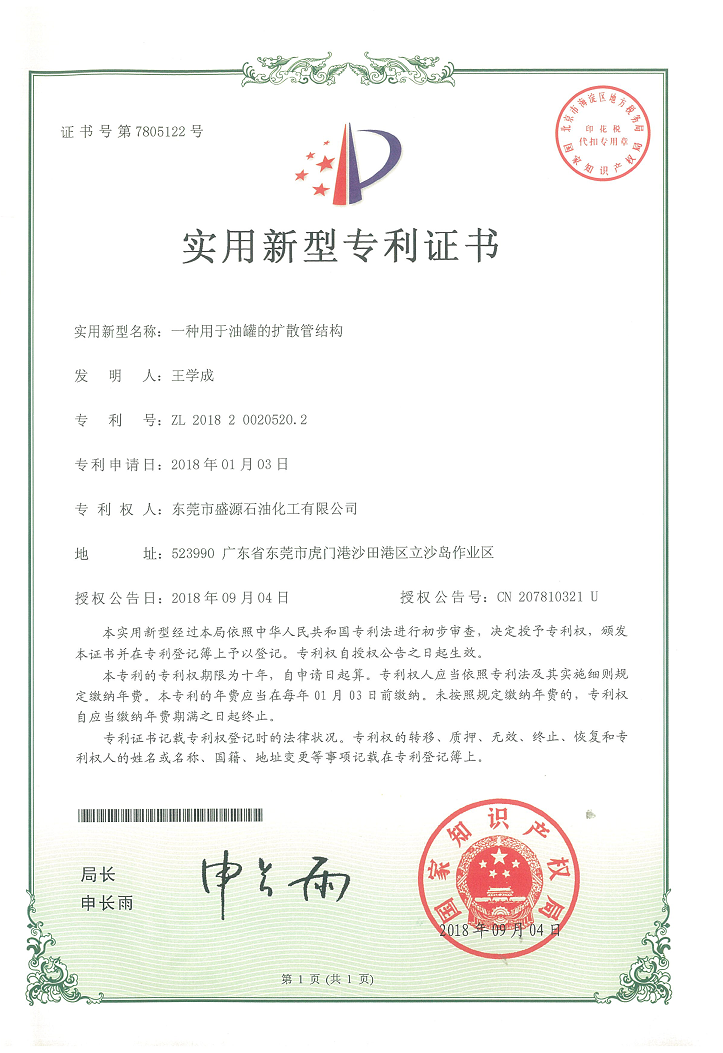 实用新型扩散管结构专利证书