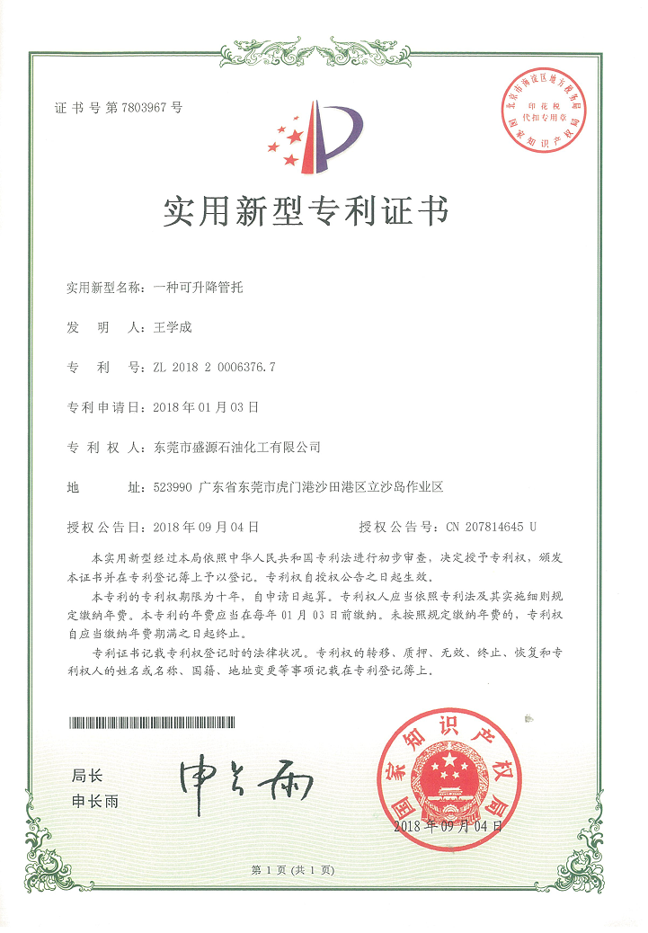 实用新型升降管托专利证书