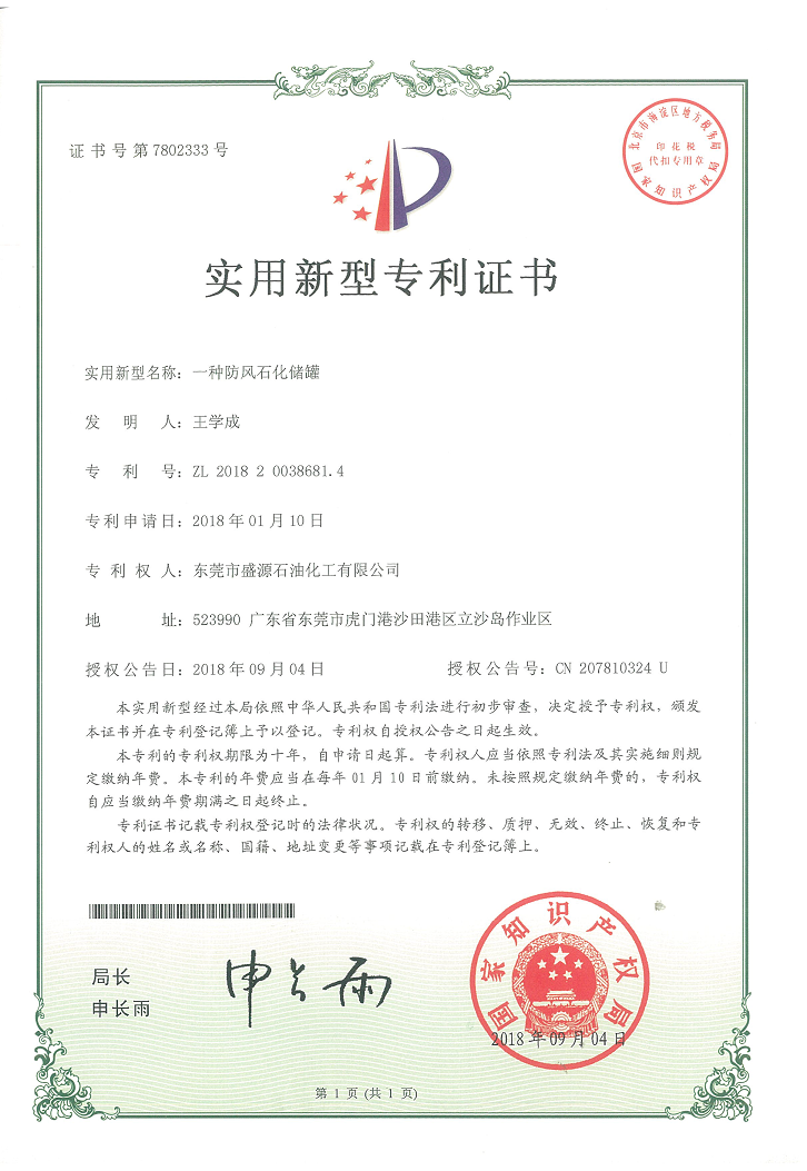 实用新型防风石化储罐专利证书